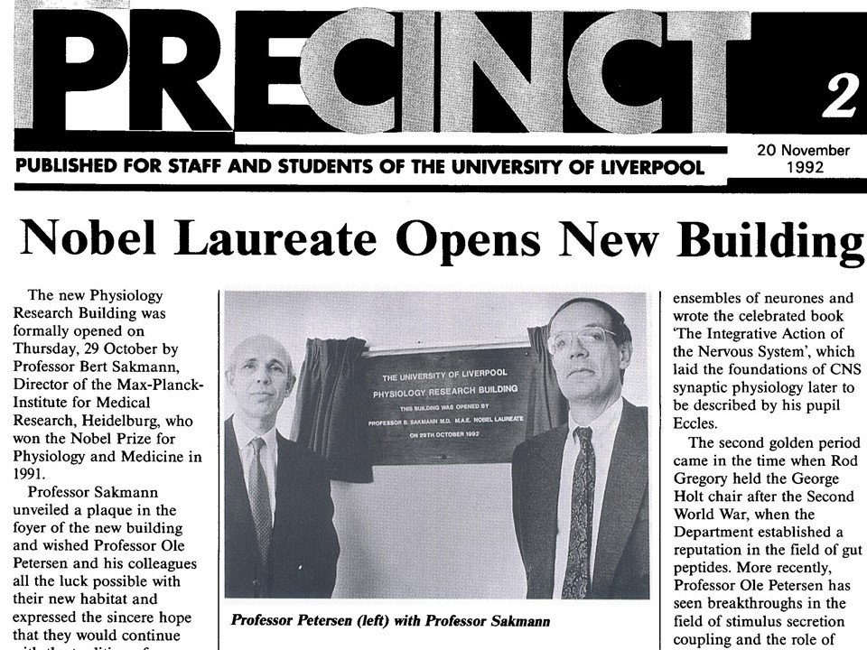 One of the highlights of my Liverpool period was the opening of the new Physiology Research Building in 1992 by the Nobel Laureate Bert Sakmann MAE, who was elected a Foreign Member of The Royal Society a few years later. Many years later, in 2006, it was a great privilege for me to give the introductory ‘Laudatio’ for Bert at the AE Annual Conference in Budapest, when he gave the Erasmus Lecture.”