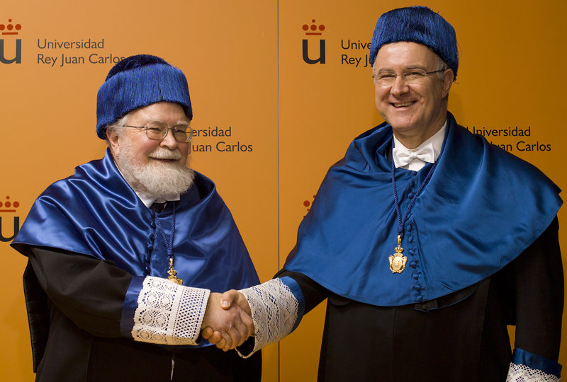 Prof. Sanjuán congratulates Prof. James Yorke on the award of the Doctor Honoris Causa from the University Rey Juan Carlos in 2014.