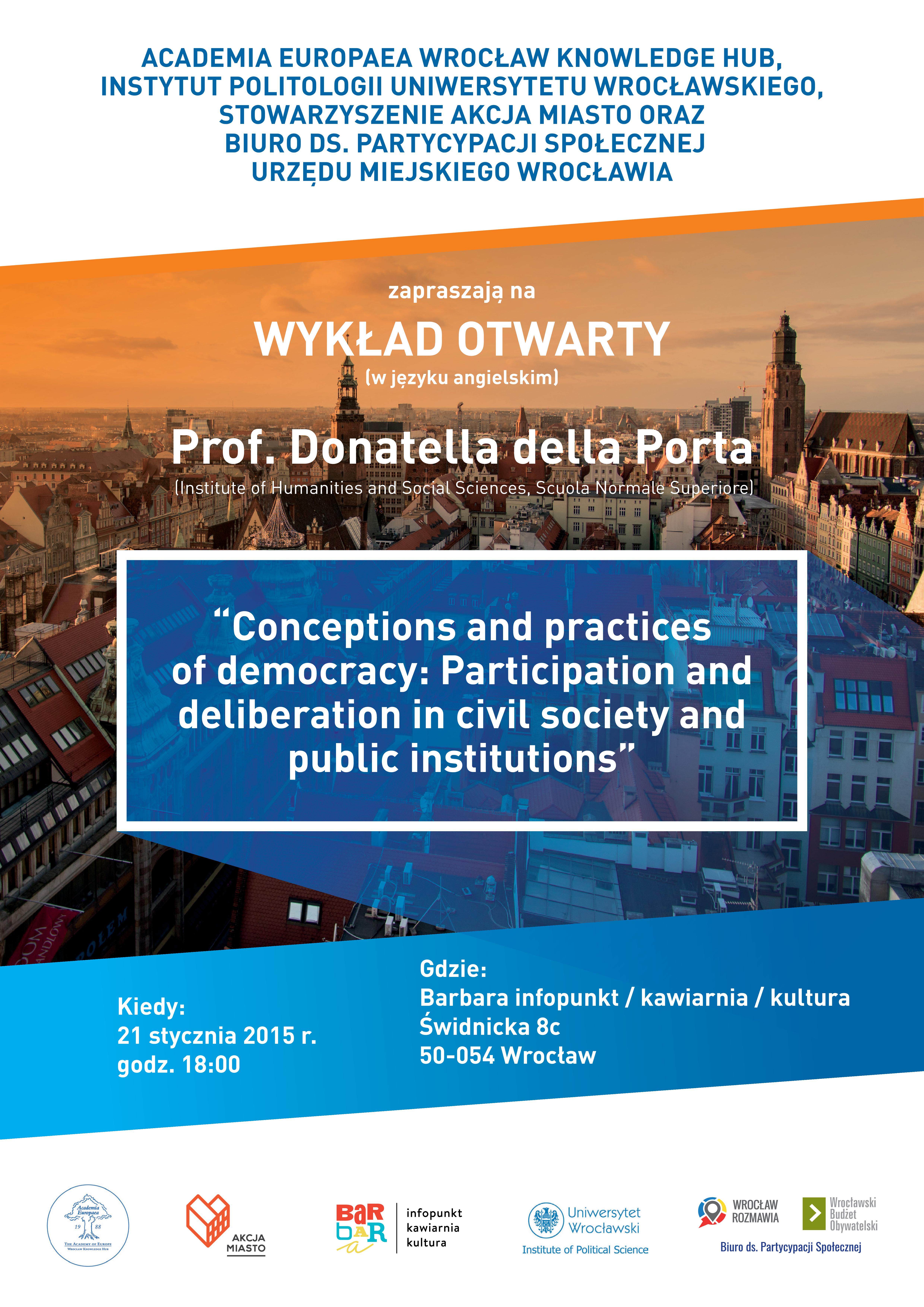 Academia Europaea Wrocław Knowledge Hub, Institute of Political Science at University of Wrocław, Association Akcja Miasto and Citizen Participation Office of Wrocław Municipality Office invite students, academic teachers and citizents of Wrocław on a lecture of Donatella della Porta on Conceptions and practices of democracy: Participation and deliberation in civil society and public institutions.