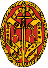Upon an oval medallion of vermilion, enclosed by a scroll a cross-hilted sword belted and sheathed, pommel upwards, between two spurs, rowels upwards, the whole set about with the sword belt, all gilt.